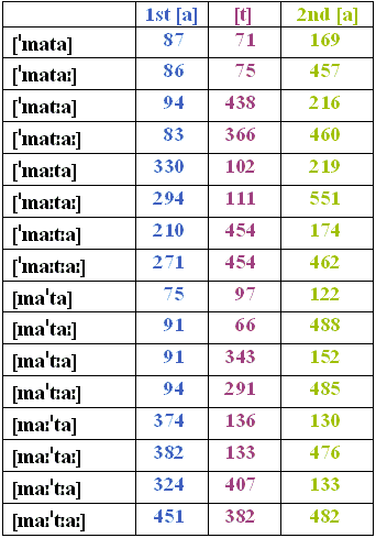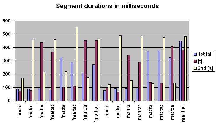As can be seen, the basic distinctions between long and short are preserved here on a relative basis: between any two minimal pairs, the longer segment is longer than the shorter one. There is also a certain amount of what one might loosely call "allophonic" variation (perhaps a transfer effect from my English, or just natural phonetic processes, or idiosyncratic strategies for saying these sounds). Thus, final vowels tend to be longer than non-final, and an apparent strategy of "staccato" stress makes many vowels a bit shorter when they are stressed.
